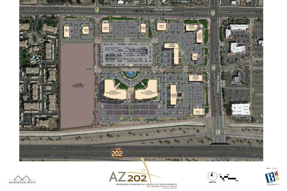AZ/202 is Meridian West’s latest development, positioned at the Gateway to downtown Chandler. Located on a full diamond interchange at the northwest corner of Arizona Avenue & the Loop 202, this premier project provides outstanding visibility and access from the new SanTan Freeway. The development offers a fantastic option for users looking to tap into the area’s skilled labor force and tremendous demographics. AZ/202 will contain a variety of product types that flow together and blend within one exciting, mixed-use development project.